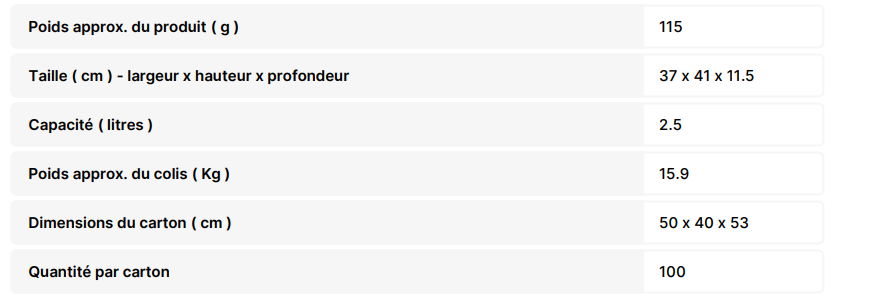 - Capacité : 2,5 litres
